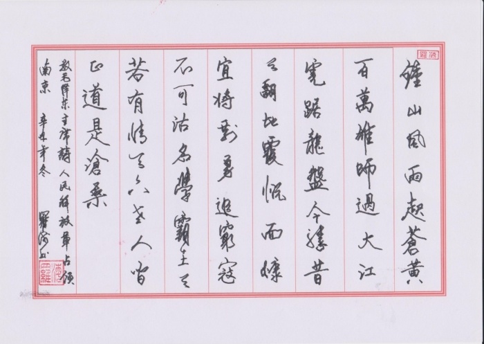 艺木简介: 罗海,广东高州市人,1957年11月出生,大学本科毕业,中共党员,退休干部,现居住广东深圳市。他曾多次获省厅、市局等“优秀生产工作者”、“优秀共产党员”等荣誉。现专职书法、绘画。为河南省硬笔书法研究院研究员、中艺星光文化艺术平台高级会员、中华传统文化促进会会员、北京及象书画家协会会员,北京文微明书画院会员、红旗飘飘艺术专业委员会会员等。他先后在部队和地方工作,为军人转业干部、工程专家。历任工程师、高级工程师、教授、总工程师、副总经理等职。罗海自幼年在家庭、环境的熏陶之下,怀揣着对艺术的追求和热爱,爱好广泛,尤其酷爱书画艺术,仿佛每一笔,每一划,都承载着他对生活的感悟和对美好的追求,在闲暇之余,写写画画,擅长毛笔、钢笔、粉笔、铅笔等书法,无一不精,刻钢板、国画、素描、写生等样样在行。早在中学时期,罗海就出类拔尖,多次获毛笔、钢笔等书法评比大奖,成为校园内小有名气的小书法家,此外,他常常组织、参与学校墙报宣传、黑板报、工地报、展板的编制和设计等工作,展现出非凡的创意和独特的专业视角。进入大学后,罗海更是担任校刊、杂志书法、美术编辑等,将其艺术才华发挥得淋漓尽致,在那个没有电脑的年代,凭着自己的专长和优势,刻钢板、编制教材、材料,制作奖状、证书、证件等,其艺术专长得到很好的锻炼和充分的提升。罗海的艺术之路,仿佛是一幅绚丽多彩的画卷,诉说着他对艺术的追求、热爱和执着。他的每一次书写、每一次绘画,都是对生活的深刻领悟和对艺术的表达,他用自己的才华和努力,将这份对艺术的热爱传递给更多的人。罗海曾参与中国硬笔书法协会主办的“国粹杯”比赛并获奖;在全国书法网络大赛中获优秀奖;获中国少儿美术杂志社高级培训师资格;受邀参加2024年中国关工委教育中心鸟巢嘉年华奥运健儿出征书画比赛并获金奖等;其部分作品被选入邮政出版“建国伟业,庆祝中华人民共和国成立75周年”主题限量版珍藏邮品,在百度,网易,今日头条,中集邮网均有报载;他被编入建国伟业中国艺术大家作品集《名家大作》;为中国国家艺术网庆祝新中国成立75周年所推荐的艺术家。他被书画进万家活动组委会授予“人民书画家”称号;被中国文化与教育诚信品牌联盟工作委员会授予“诚信品牌书画家”;罗海部分作品被编入《文化精英,绽放梦想》特辑。被中国文化人才库授予2023年度优秀文化工作者,中华书画精英等。他早年书临大量碑、贴,含舒同体,柳体,颜体等,笔章得体,书写结构严密,行笔收放自如、有力,传统笔法和现代结合一体,下笔的力度,刚柔相济,柔美婉约,体现出了深厚的文人底蕴,形成独特的一体,得到同行的肯定。他在及象书画院高级研修班结业,师承赵春秋、史国良、李树宝等知名大师,以及陈墨、欧阳青墨、曲寒山、澄怀、若明、木清等知名老师。因有工程设计基础,在绘画和构图上形成了自己的风格,显出自有的张力、气韵和功底,画面笔触奔放,富有生命力。罗海先后获文旅部书法、绘画等高级艺术资格证书,为传承、繁荣、发展中国传统文化做出了积极的贡献。罗海同志热心公益事业,经常参与一些义卖义捐活动,如捐赠某边防部队,某经院作品等。在中国关心下一代工作委员会倡导下,发挥了“五老”积极的作用。 于2024年12月加入中国通俗文艺研究会红旗飘飘艺术专业委员会会员。