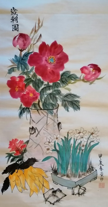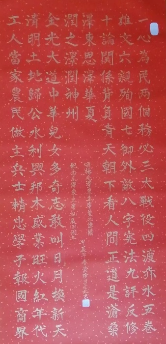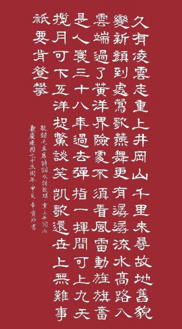 个人艺术简介 黄华晶,女,汉族1945年9月出生。福建省永安市人。中艺星光绿色书画平台普通会员。 1964年参加工作。从事教育工作35年。高级教师职称。共产党员。 2005年随儿子一家来北京。 积极参加社区志愿者服务,夕阳红太极队及文体表演活动。2018年潜心学习书画。曾敬拜爱新觉罗启元老师,刘玉芬老师,北京书画名家马登老师,赵長霖老师,郭軍,郭春雷老师学书法绘画。为进一步提高技巧技能,自费参加中国国画学习。书画作品多次参于比赛也荣获,一,二,优秀奖。2024年5月至7月参加北京中艺星光绿色书画平台举行千人书画大联展中作品《赠清漳明府侄聿》荣获金奖。《将敬酒》参加百米長卷展。临帖《颜真卿多宝塔碑》被敦煌收藏。国画《清供图》和隶书金奖作品也被高价收藏。2023年7月书法作品获中国国际书画艺术研究会搜予“爱心书画家”称号。国画《东方红》被中国人民解放军63612部玩收藏。 国画《硕果飘香庆丰年》参加《夕阳颂全国老年书画艺术大展获优秀奖。 2024年七月一幅书法作品《颂掦毛泽东主席豐功伟绩》荣获一等奖。 今后要继续努力,为弘杨中华民族文化献爱心。 2024年12月12日。黄华晶写于北京。
