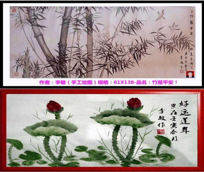 李敏画家简介: 李敏,汉族,出生于1961年,祖籍,广西梧州岑溪市岑城木榔人,现居住岑溪市城北路118号南珠学校,建筑设计绘图出身,大学学历,进修于中国国家画院。高级美术师,全国实力派优秀书画名家,签约艺术家,北京秦韵源书画院会员、中国通俗文化研究会会员、美育中国”校外美育工作组辅导员。中艺星光文化艺术平台高级会员(工作站站长)。2000年—2025年岑溪市南珠电子电工职业培训学校创始人(梧州市成学教育机构创始人)职务:校长,国家职业技能《二级技师》曾担任职业技能鉴定职务。具备国家文许多部山水、花鸟、书法科目高级技能。2024年受邀参加中国与多民族玻利维亚国建立两国文化交流桥梁,特授予“中玻文化交流使者”称号。2024年受缴,喜迎法国巴黎奥运会开幕之际,在国家鸟巢体育场参加参加美育中国青少年文体嘉年华总展演活动!荣获金奖! 2022-2024年荣获中国文艺优秀工作者,人民书画家、诚信品牌书画家、中华书画精英,入编中国文化艺术人才库,2023年参加全国书画名家大赛,荣获由中国(香港)美术家协会、中国(香港)书法家协会、中国国家艺术促进会、中国国际孔子文化研究院、北京国墨巨匠书画艺术中心,联合举办第二届《“华夏兰亭奖”》获奖!2024年受邀盛世收藏第四届北京书画精英作品展,荣获绘画金奖! 艺术风格:以重彩山水、花鸟、鱼虾、工笔及人物写意,葡萄写意、重彩山水技法,师从齐白石再传弟子李树宝大师传承。以书入画,勤学苦练,崇拜齐白石,涨大干,徐悲鸿,李苦禅,李白,王羲之,兆孟頫及历代数位名家!以古为鉴修得心源。由于个人作品创作突出,与时具进,历求创新,题材丰富。 作者:所有真品:除采用传统国画技法以外,具有创新优势特点,注重实景写作和心灵创意为主,创作过程:分阶段性。讲求立意、意境、构思、构图、设色、罩染、色彩叠加法,线条重复勾勒、皴擦点染自如、笔墨要流畅,等。重用矿物材料,使画质色彩沉稳,华丽富贵、大气清新、构图突出、寓意深刻、气韵生动,由于画质和意境诱人。深受国内和海外的广泛收藏。2023部分获奖品种,山水、花鸟、龙虾、人物、葡萄写意、鸿运当头、兰亭序字画、竹石图、寿桃、荷花图、等10多个品种,获中国人民解放军某部队所收藏。2024年(金虾图)被多民族玻利维亚国驻华大使馆收藏。2024年“迎春千名书画家交易大联展”(金箔孔雀图,百子添孙)在展览中被藏家收藏。2024年《幸福家园》在国家鸟巢体育场总展演,荣获金奖! 作者从事绘图领域35年,近年累计数次参加全国各种书画名家大赛和文艺活动,荣获20多项(现代书画名家)荣誉奖(金奖)受多家媒体各大网站和人民日报刊登报道,2023年北京曲风书画院全国《第五届曲风杯决赛》1000多幅,经专家组严格公平、公正、阳光、干净评审,最终评选出优秀获奖10件,其中李敏作者(幸福家园)绿水清山大图,风景诱人,高难度创作突出,受到业界公认具有潜力的当代艺术家(签约艺术家)。作者重点收藏齐白石、张大千、徐悲鸿、李苦禅、关山月、王雪涛等20多位名家杰作。为发扬传统国画技法,重点结合现代写景创作为主,题材丰富灵活。作者积极参与慈善机构组织义捐,义拍、义卖公益活动,获得各种荣誉称号。